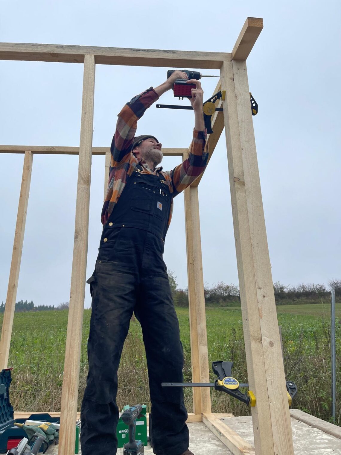 Freitags war noch Materialbeschaffung angesagt. Am Samstag vormittags machten wir Zuschnitt, luden alles auf den Wagen und begaben uns auf Abenteuerfahrt mit 5km/h. Ging alles gut. Der Traktor kam besser über den Feldweg als der alte Fiat, den Johnny fast in den Graben versenkte.